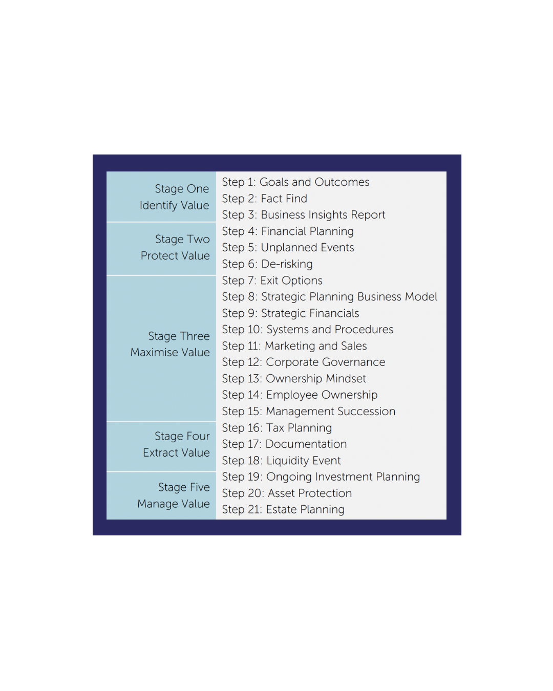 Developed across 16+ years of business and exit planning, the 21-Step framework forms a detailed strategy to guide business owners in identifying, protecting, maximizing, extracting and managing wealth. Whether your client intends to continue their growth, retire or move on to their next venture, the intelligent planning recommendations within each step create a pathway to financial certainty while building a healthier business.